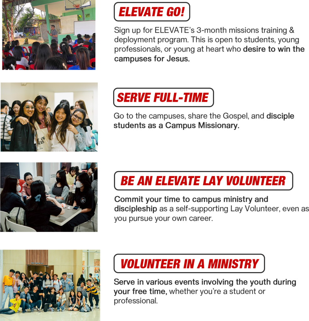 Like Campus Missionaries, Elevate Lay Volunteers dedicate their lives to discipling the youth. The requirements are the same, except that Elevate Lay Volunteers are expected to serve for a minimum of 1 year only. Additionally, Elevate Lay Volunteers are self-supporting, while Campus Missionaries raise support.